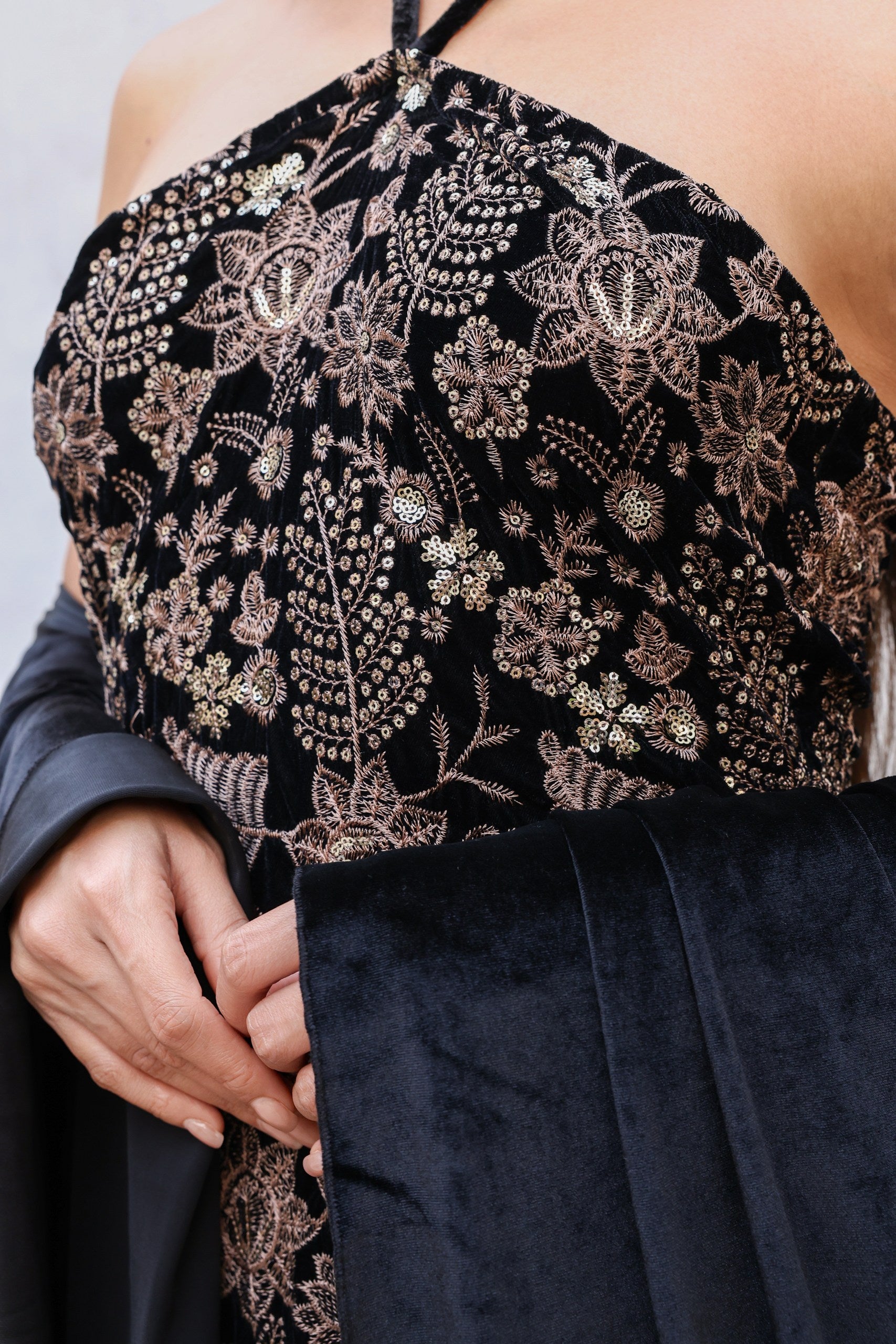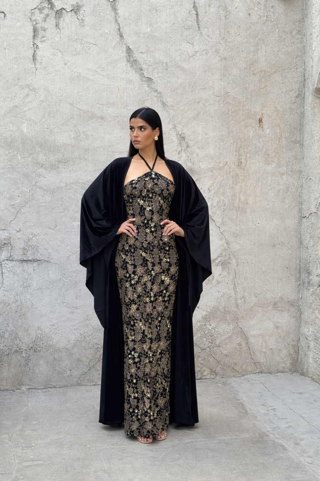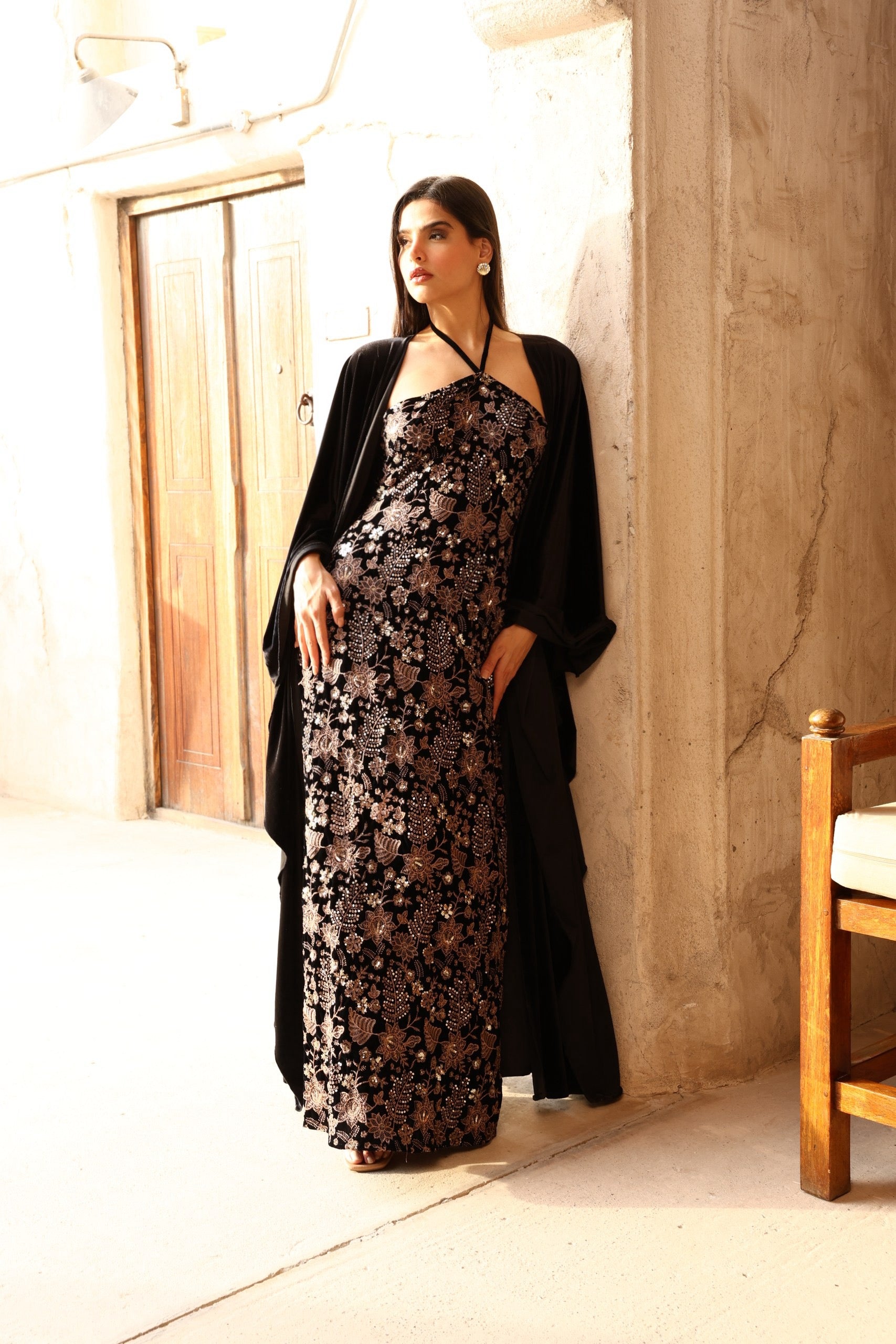 A velvet embroidered dress featuring a graceful silhouette, completed with an elegant abaya-style cape for a refined and sophisticated look.
