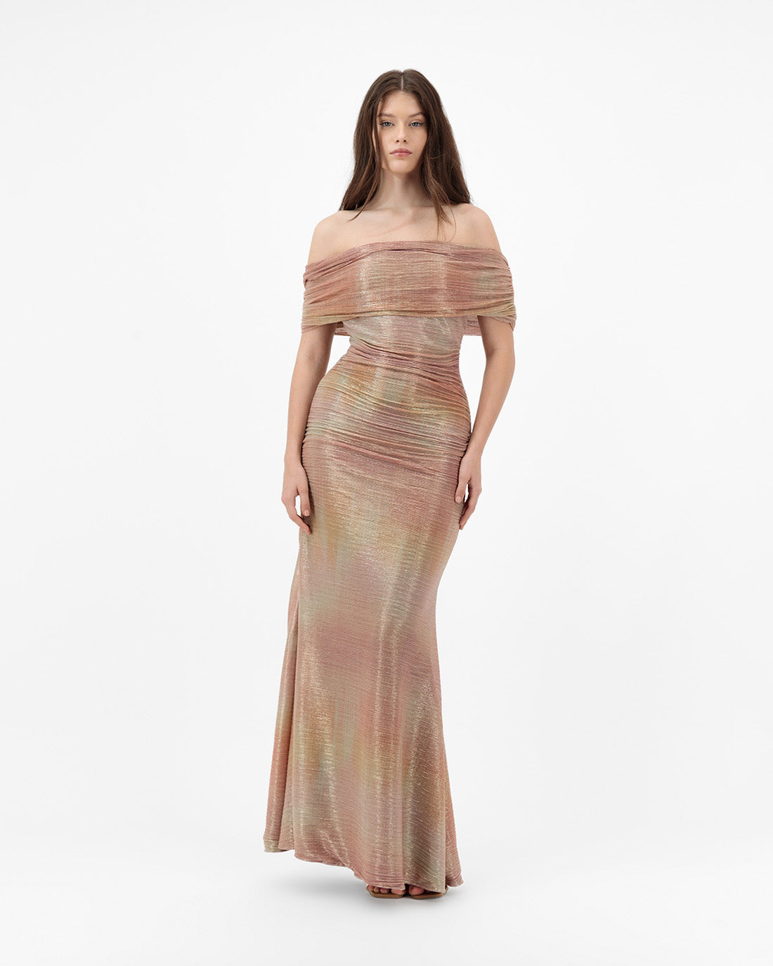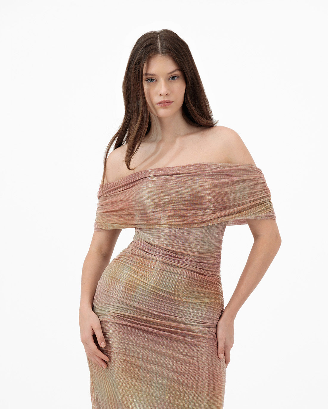 Off-shoulder pink and gold gown with delicate pleats at the waist and hips, designed to create a sleek, feminine silhouette.