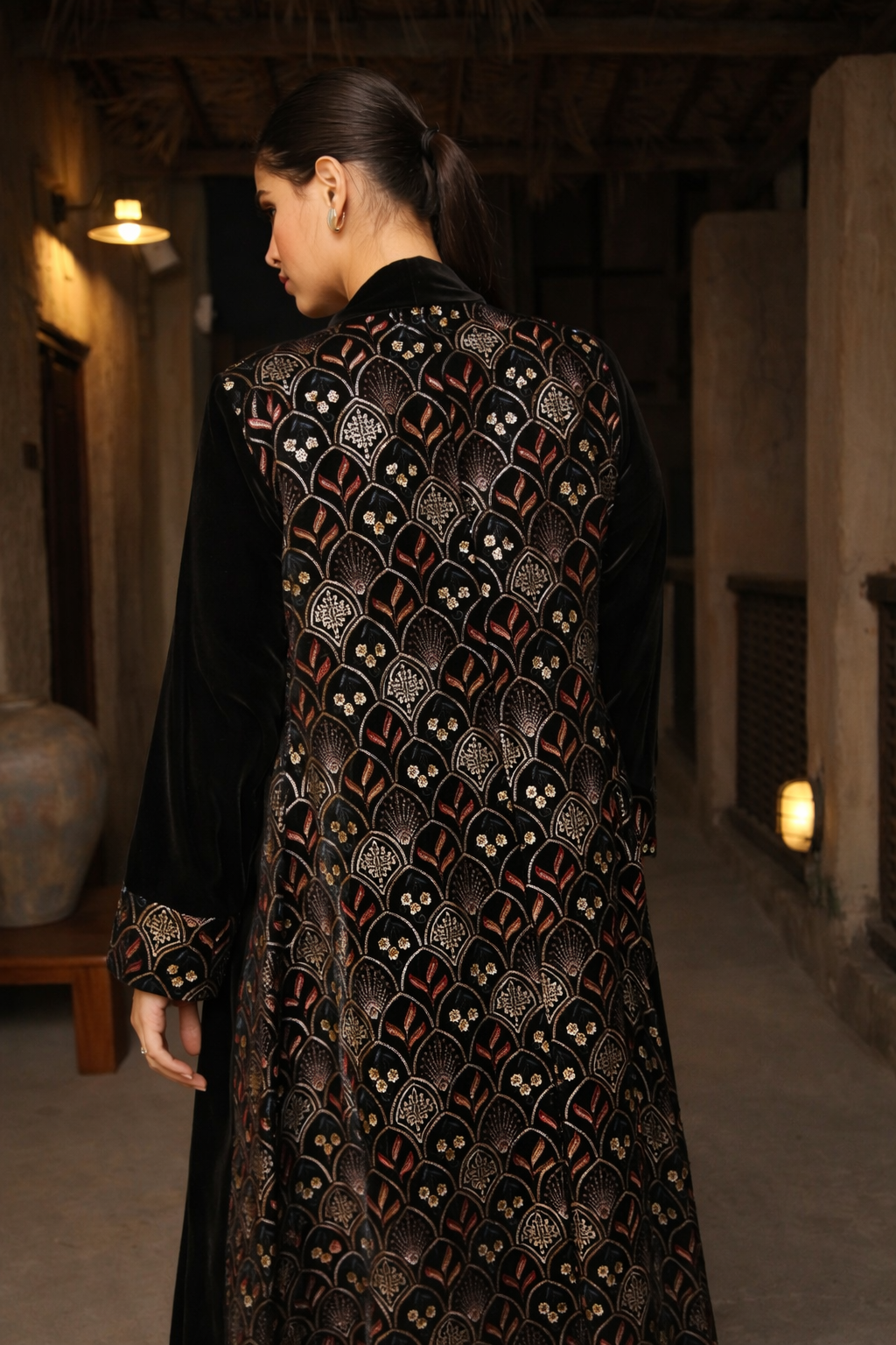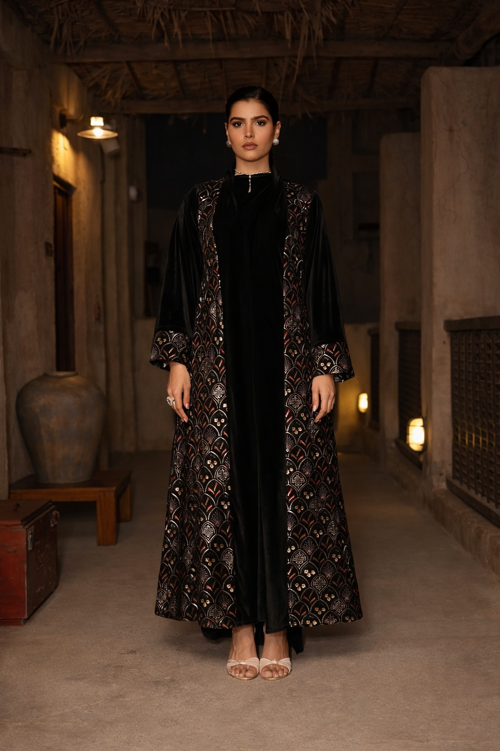 two-piece set featuring a flowing abaya-style outer layer in rich black velvet with intricate heritage embroidery