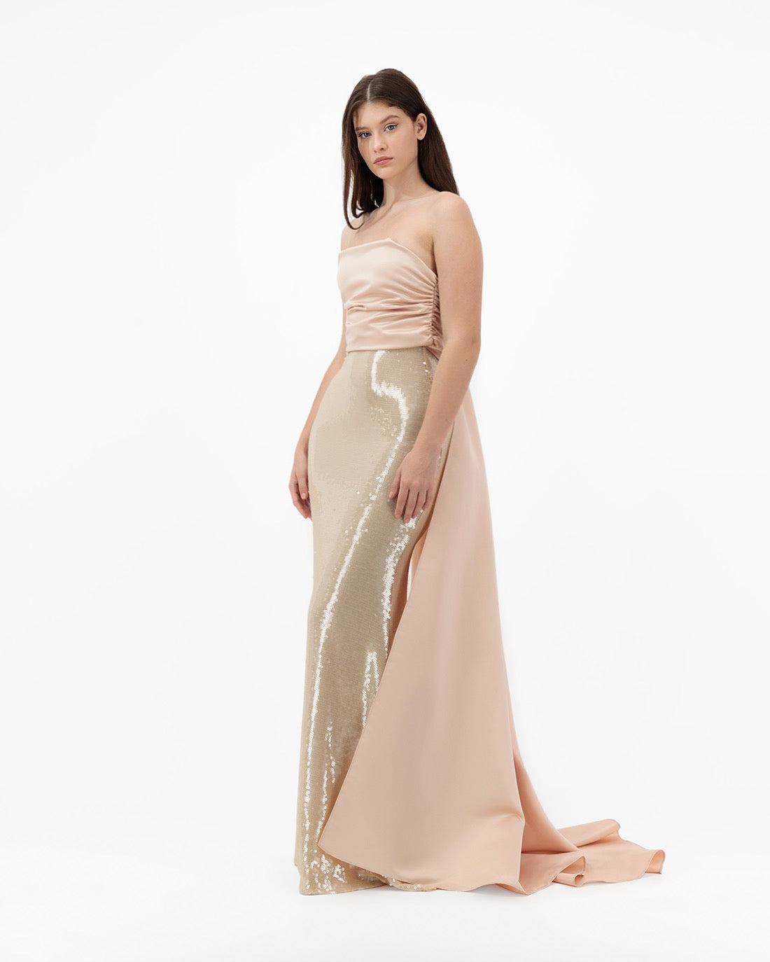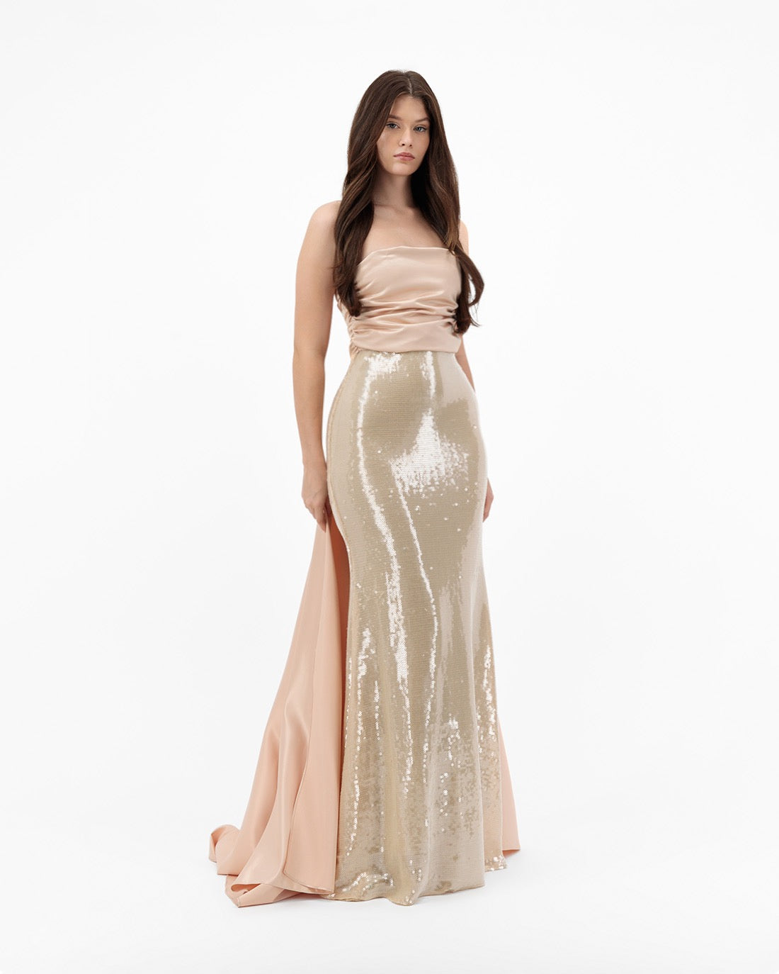 Golden Spark – Sequined evening gown featuring a taffeta bodice and a graceful train. Designed to shimmer with every move for a striking, elegant look.