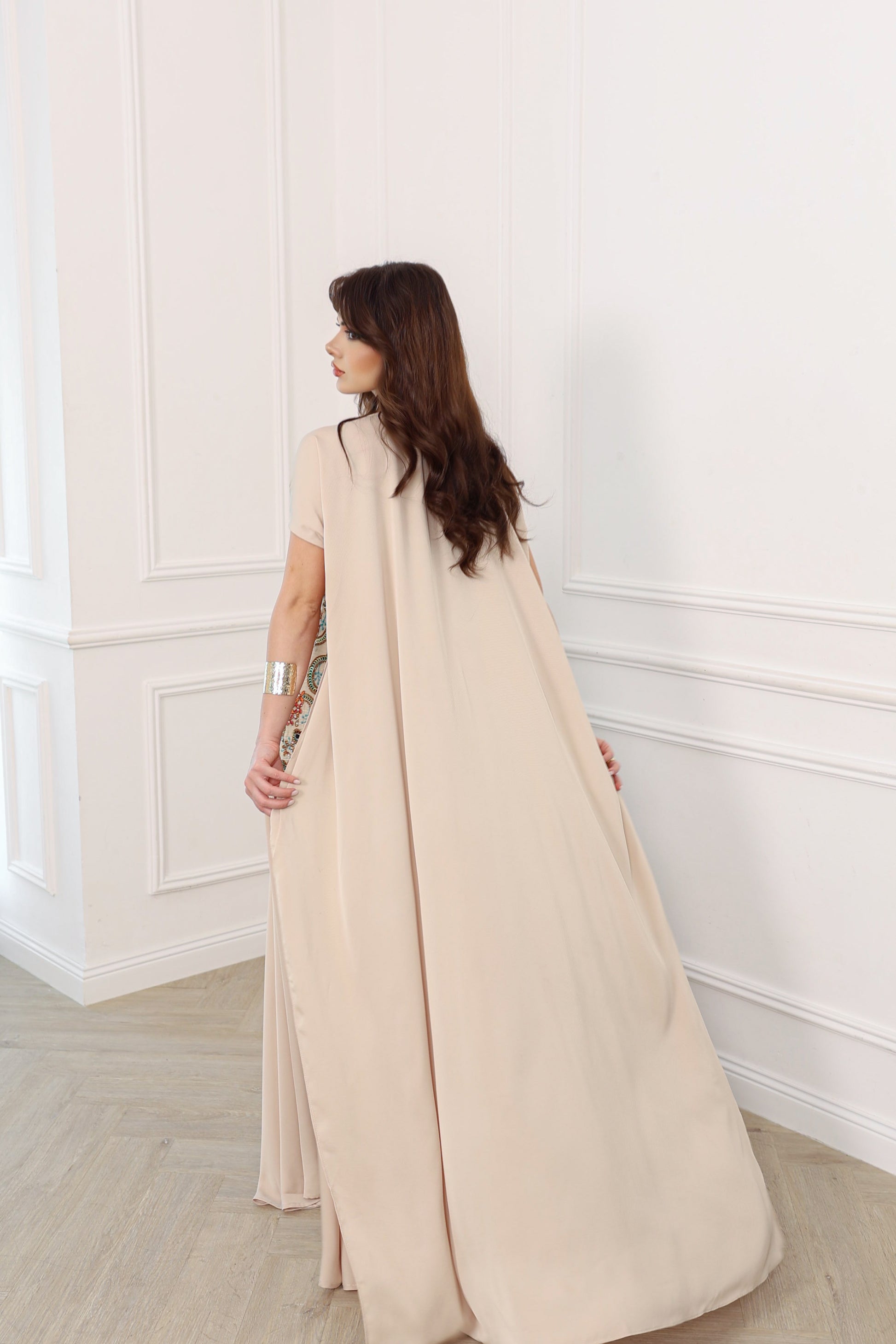 Noor is a refined statement dress featuring intricate embroidery and a fluid silhouette, designed for timeless elegance and elevated Ramadan occasions
